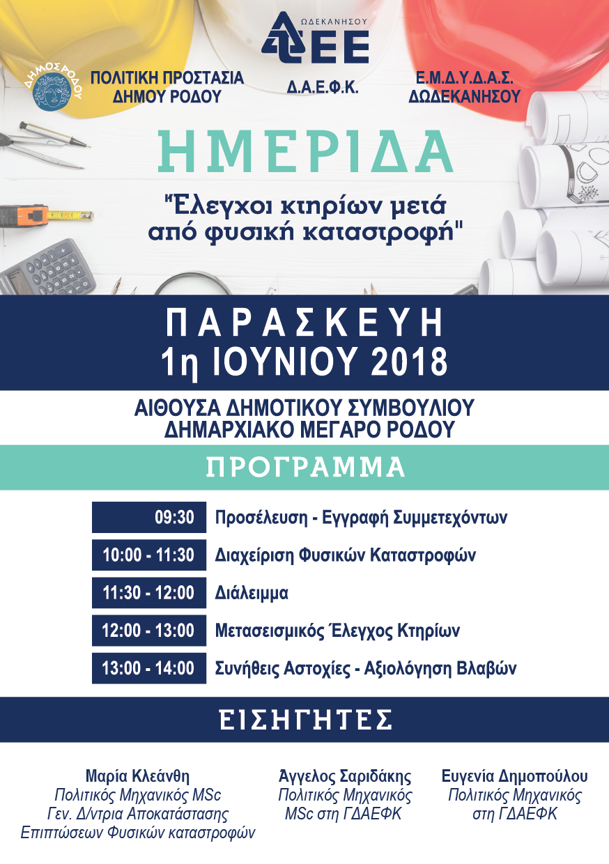 Το Τεχνικό Επιμελητήριο Ελλάδος – Περιφερειακό Τμήμα Δωδεκανήσου, η Ένωση Μηχανικών Δημοσίων Υπαλλήλων Διπλωματούχων Ανωτάτων Σχολών Δωδ/σου (Ε.Μ.Δ.Υ.Δ.Α.Σ) και το γραφείο Πολιτικής Προστασίας Δήμου Ρόδου, σε συνεργασία με την Διεύθυνση Αποκατάστασης Επιπτώσεων Φυσικών Καταστροφών (Δ.Α.Ε.Φ.Κ), διοργανώνουν την Παρασκευή 1η Ιουνίου 2018, στην αίθουσα Δημοτικού Συμβουλίου, στο Δημαρχιακό Μέγαρο Ρόδου, από τις 09:30 έως τις 14:00,