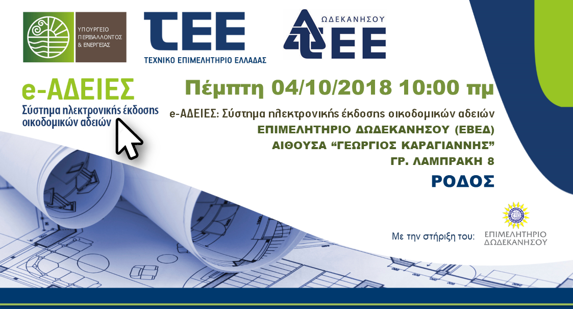 Tο Τεχνικό Επιμελητήριο τμ. Δωδεκανήσου σε συνδιοργάνωση με το Τεχνικό Επιμελητήριο Ελλάδος και το Υπουργείο Περιβάλλοντος και Ενέργειας, διοργανώνουν ενημερωτική-εκπαιδευτική συνάντηση για το νέο πληροφοριακό σύστημα e-Άδειες, σύμφωνα με την υπ’ αριθμ. ΥΠΕΝ/ΥΠΡΓ/48123/6983/2018 (ΦΕΚ Β’ 3136) Υπουργική Απόφαση «Διαδικασίες ηλεκτρονικής υποβολής, ελέγχου και έκδοσης των διοικητικών πράξεων του άρθρου 29 του ν.4495/2017 και καθορισμός ηλεκτρονικών υπηρεσιών σύμφωνα με τις διατάξεις του άρθρου 33 του ν.4495/2017».