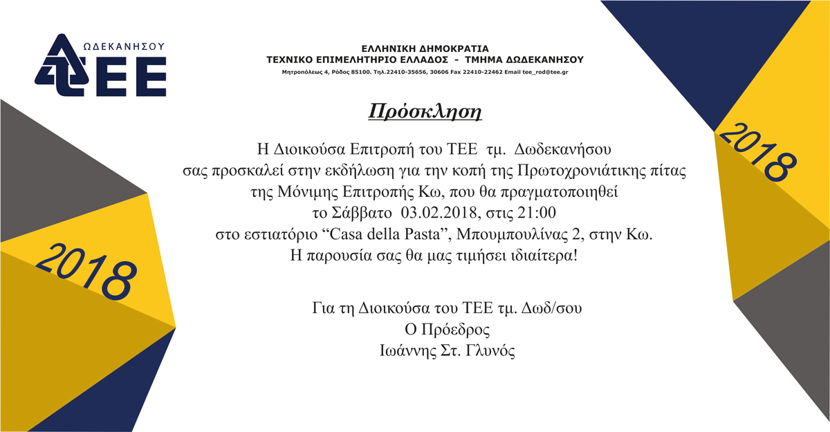 Το ΤΕΕ τμήματος Δωδεκανήσου σας προσκαλεί στην εκδήλωση για την κοπή της Πρωτοχρονιάτικης πίτας της Μόνιμης Επιτροπής στην Κω που θα πραγματοποιηθεί το Σάββατο 03-02-2018 στις 21.00 στο εστιατόριο “Casa della Pasta”, Μπουμπουλίνας 2, Κως.