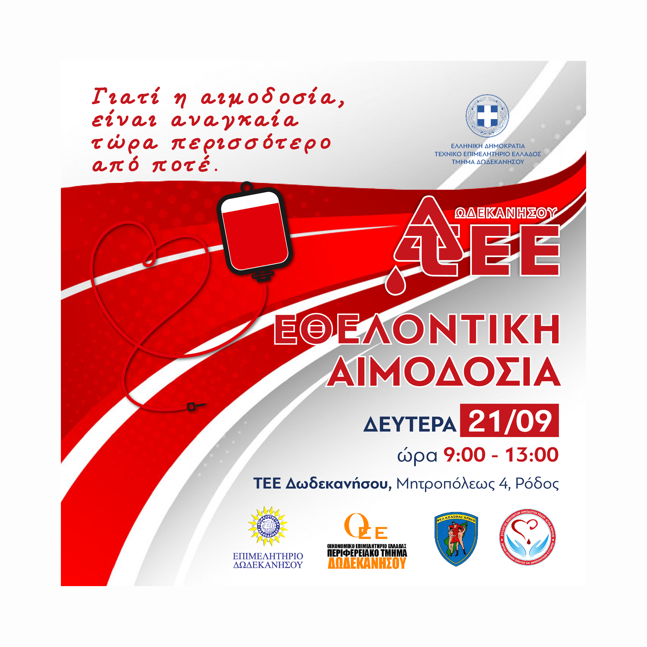 Είναι μια πρωτοβουλία, του ΤΕΕ Δωδεκανήσου σε συνεργασία με το Επιμελητήριο Δωδεκανήσου (ΕΒΕΔ), το Οικονομικό Επιμελητήριο Ελλάδας (Περιφερειακό Τμήμα Δωδεκανήσου), την 95ΑΔΤΕ και τον Σύλλογο Εθελοντων Αιμοδοτών Ρόδου «Άγιος Εφραίμ», τηρώντας όλα τα απαραίτητα μέτρα προστασίας.