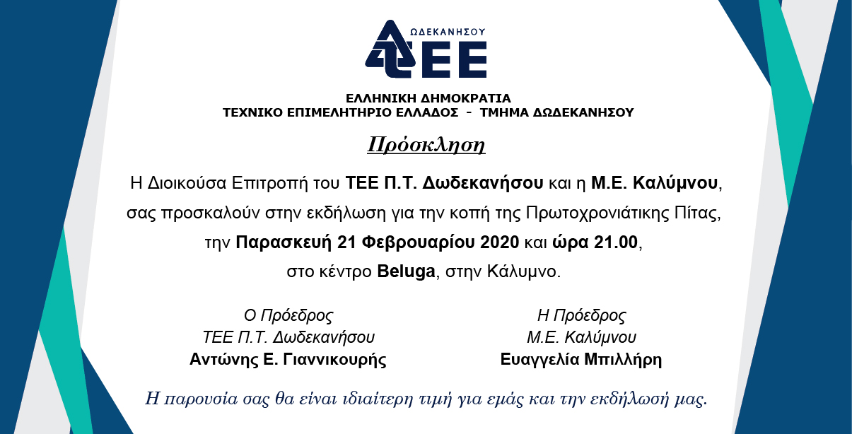 Πρόσκληση για Κοπή Πίτας 2020 της Μ.Ε Καλύμνου