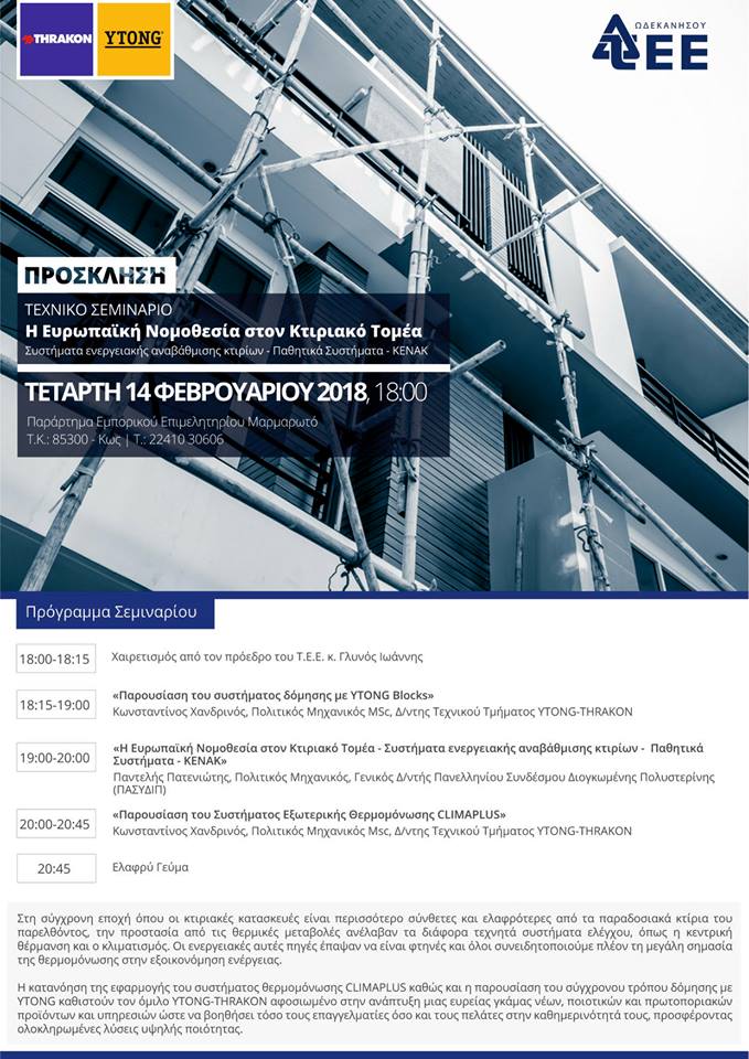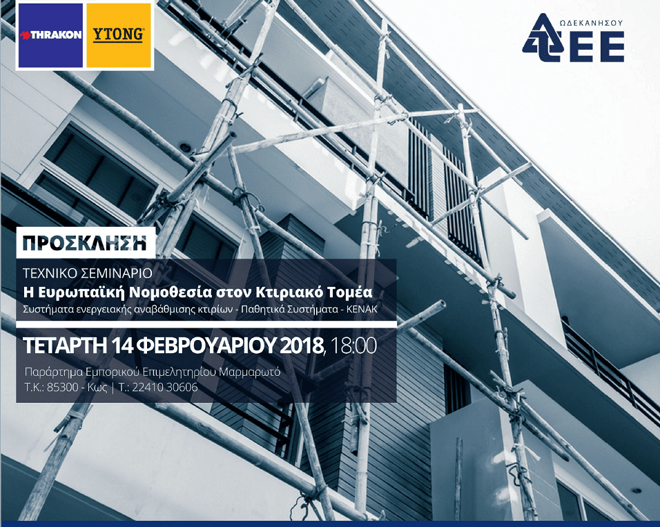 Το ΤΕΕ τμ. Δωδεκανήσου και η Μ.Ε. Κω σε συνεργασία με τον όμιλο YTONG-THRAKON διοργανώνουν Τεχνικό Σεμινάριο την Τετάρτη 14 Φεβρουαρίου 2018, στις 18:00, στο παράρτημα του Επιμελητηρίου (ΕΒΕΔ) στην Κω, με θέμα: