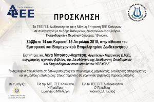 Το Τμήμα Δωδεκανήσου του ΤΕΕ και η Μόνιμη επιτροπή Καλύμνου σε συνεργασία με το Δήμο Καλυμνίων διοργανώνουν σεμινάριο Πολεοδομικών Θεμάτων διάρκειας 18 ωρών, στις 14 και 15 Απριλίου, στην αίθουσα του Εμπορικού και Βιομηχανικού Επιμελητηρίου, στην Κάλυμνο, με εισηγήτρια τη Λένα Μπούτου Λεμπέση. Το σεμινάριο απευθύνεται σε διπλωματούχους και πτυχιούχους μηχανικούς ελεύθερους επαγγελματίες και δημοσίους […]