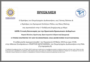 Ο Πρόεδρος του Επιμελητηρίου Δωδεκανήσου, κος Γιάννης Πάππου & ο Πρόεδρος του Εμπορικού Συλλόγου Ρόδου, κος Νίκος Μπόνης σας προσκαλούν στην 1η Εκδήλωση Ενημέρωσης με θέμα: GDPR: Γενικός Κανονισμός για την Προστασία Προσωπικών Δεδομένων Νομικό Πλαίσιο, Οργάνωση, Προετοιμασία & Πρακτική Εφαρμογή Ο ΤΡΟΠΟΣ ΕΦΑΡΜΟΓΗΣ ΤΟΥ ΑΠΟ ΤΙΣ ΕΠΙΧΕΙΡΗΣΕΙΣ. ΕΝΑΣ ΑΚΟΜΗ ΝΟΜΟΣ Ή ΚΑΤΙ ΠΑΡΑΠΑΝΩ; […]