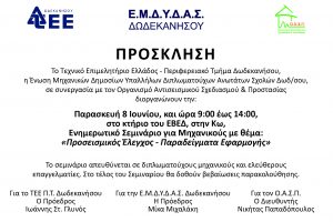 Το Τεχνικό Επιμελητήριο Ελλάδος - Περιφερειακό Τμήμα Δωδεκανήσου, η Ένωση Μηχανικών Δημοσίων Υπαλλήλων Διπλωματούχων Ανωτάτων Σχολών Δωδ/σου, σε συνεργασία με τον Οργανισμό Αντισεισμικού Σχεδιασμού & Προστασίας διοργανώνουν την: την Παρασκευή 8 Ιουνίου 2018, Ενημερωτικό Σεμινάριο για Μηχανικούς με θέμα: «Προσεισμικός Έλεγχος – Παραδείγματα Εφαρμογής» στο Κτίριο του ΕΒΕΔ, στην Κω, από τις 09:00 έως […]
