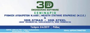 Η 3DR διοργανώνει σεμινάριο με θέμα: “Ρύθμιση Αυθαιρέτων Ν.4495 – Μελέτη Στατικής Επάρκειας” στην Αίθουσα της Αντιπροσωπείας του ΤΕΕ Δωδεκανήσου την Τετάρτη 3 Απριλίου 2019 στις 17.45 Ομιλητές: Βαδαλούκας Γεώργιος Παπαχρηστίδης Αριστείδης Βαδαλούκας Κωνσταντίνος Η εκδήλωση θα πραγματοποιηθεί υπό την αιγίδα του ΤΕΕ Δωδεκανήσου.